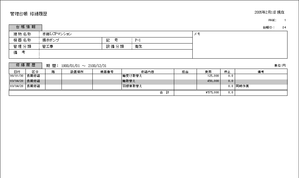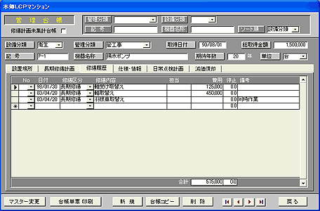 指定した期間で設備別や修繕区分別に集計も行えますので、建物ランニングコストの管理にもご利用いただけます。