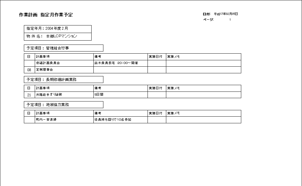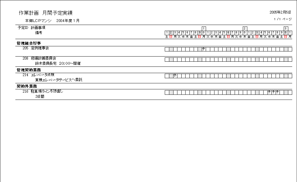 建物における一年間の作業、行事などの計画と実績、予定確認、予定表印刷を行う機能です。 大項目はマスター化できますので、修繕工事や維持保全作業のほかに管理組合行事や町会行事なども登録でき、本日の予定から、月間予定、未作業一覧、年間予実一覧など、維持管理業務や管理組合事務の支援を行います。